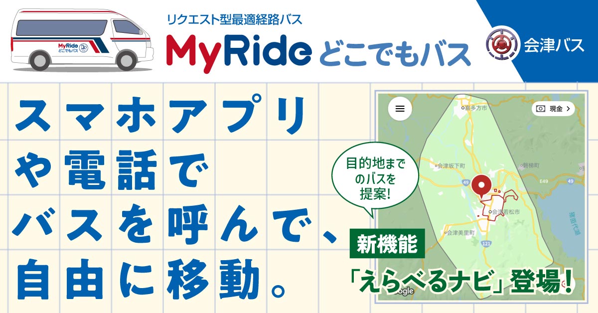 スマホアプリ「MyRideどこでもバス」は、新機能「えらべるナビ」を搭載しました。より広域になった検索エリアから、目的地までのルートをご提案します。