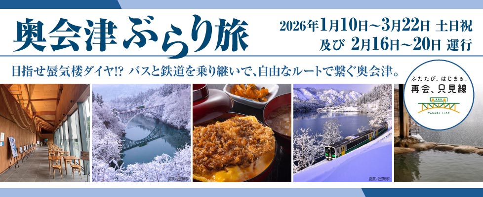 只見線全線運転再開。バスと鉄道でつないで、奥会津を自由なルートでお楽しみ下さい。